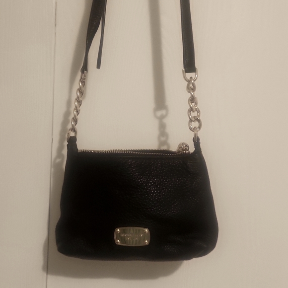 This a cute handbag if you don't want to carry a lot of stuff. It has a back snap pocket and inside has 2 drop pockets and a zipper pocket, the top zips closed. I bought this from another seller and never used it. It's very clean and well taken care of. No stains. Measurements are 8X6X2 1/2