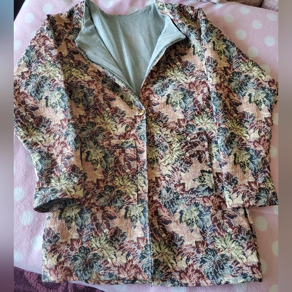 handmade jacket. size small. 2 front pockets. multicolored fall leaf pattern