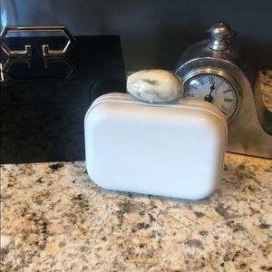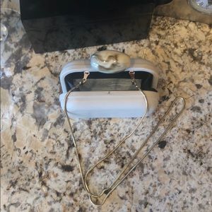 Bone Color Hard Case Marbled look Top knob closure Optional gold shoulder strap Black fabric internal