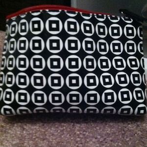Cute small sized make-up bag. Black and white. Red zipper. With a circle and square pattern. Great size to carry inside your purse!