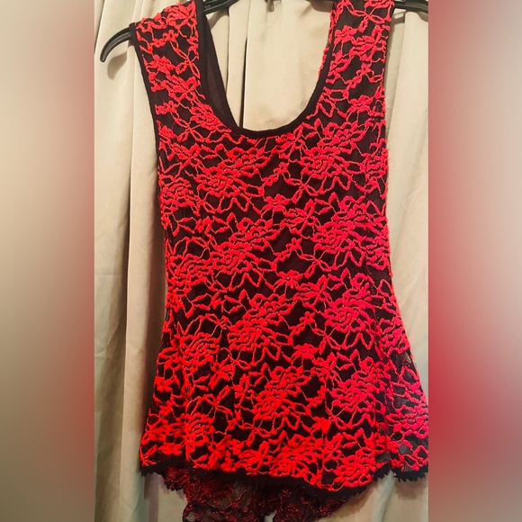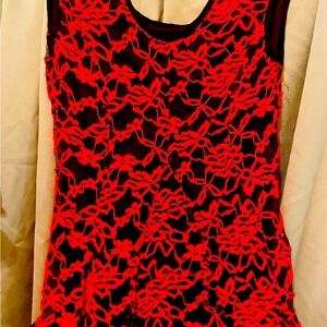 Black sheer layered with red embroidered Fitted around top and middle slight stretch and loose/slight flow on the bottom