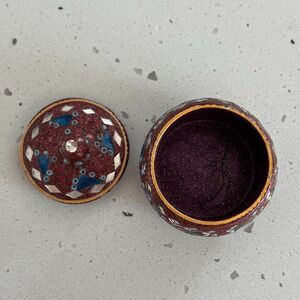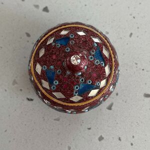 cute jewelry box teeny tiny, perfect for rings small lid with a knob for holding the top red glitter embossed with blue and clear mirror and glass triangular pieces approx 1.75" in height including top knob 1.5" diameter at bottom but widens out to about 1.75" diameter at center of dome
