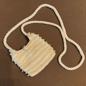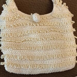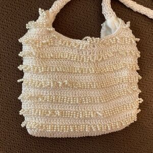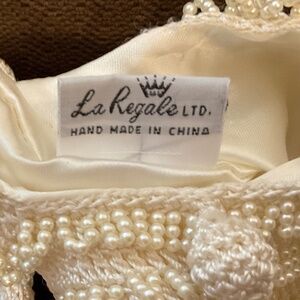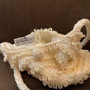 This lovely little beaded bag is beaded all around with 7 horizontal rows of 3 beaded dangles. The 43 inch strap is fully beaded into a rounded strap. The bag is fully lined with a white satiny fabric. The closure is a beaded stretchy loop that goes over a beaded ball. The purse measures 6" across and 4.5" from top to bottom. It was made by La Regale Ltd., handmade in China.