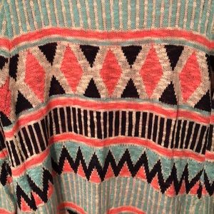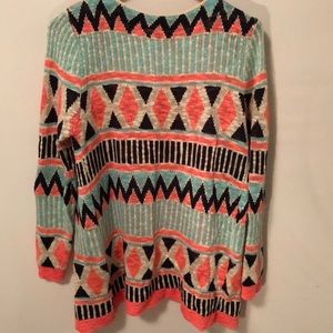 Size small pattern sweater from Dash of Chic boutique. 100% acrylic fabric. Super cozy sweater, full length sleeves, and long enough to wear with leggings! The sweater lies right over the butt. Relaxed, comfortable fit, still true to size. Neon pink zig zags with navy, baby blue, and cream pattern. Only work once. No stains or damages.