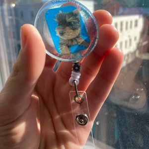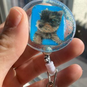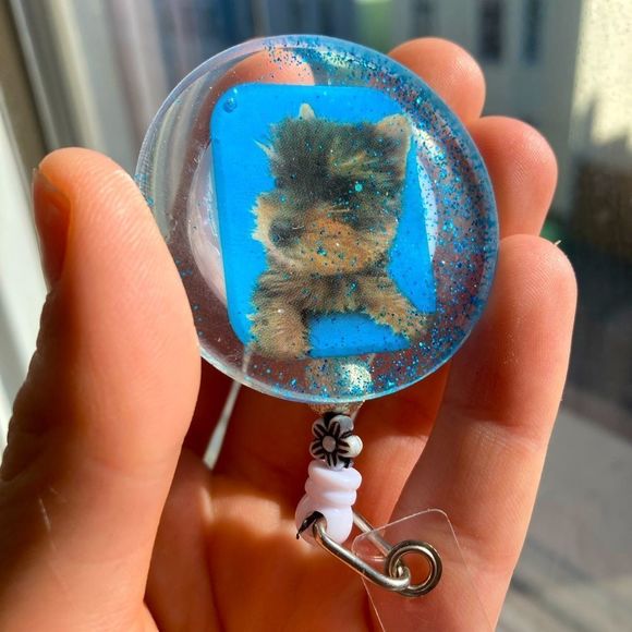 Handmade small black and brown puppy with a blue background and blue glitter badge clip with metal backing and beads on the string.