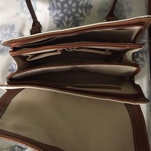 Cream and brown faux snakeskin pattern. 3 main pockets, with plenty of small pockets.