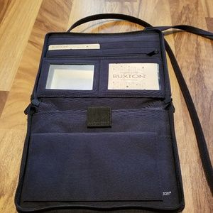 Buxton purse it has plenty of room. Comes with a checkbook area multiple credit cards slots.