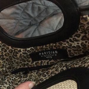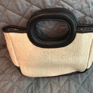 It’s like a wicker material that has a leather bottom and handles. With Leopard print inside. With a small zipper compartment. Perfect if you need something small to bring your essentials with you.