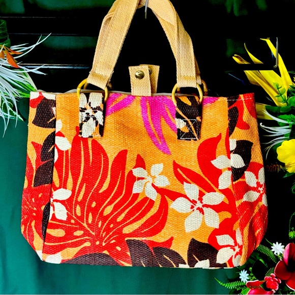 Small red monstera tote on salmon colored background. This is not a common fabric tote, feels like lauhala style