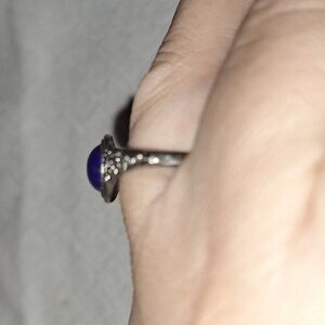 small ring with blackish blue center. Center doesn't feel like a real stone. Size 6 or 7 was my moms