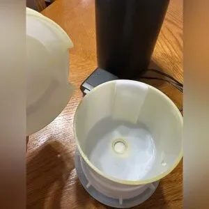 This is a small room diffuser perfect for bedroom or bathroom. It has a sleek black design. There is an adjustable automatic shut off timer that ranges rom 1/2 hr to 3 hours. There is also a ring at the bottom on that changes color and glows to give that extra calming look. This diffuser is used but well loved for. It is in excellent working condition but with minor staining due to essential oils.