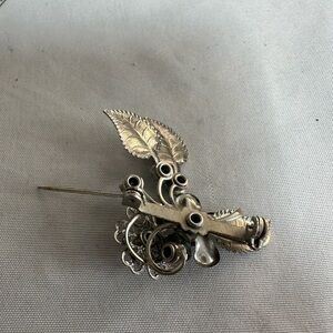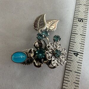 Very cute smaller style silvertone pin with flowers which have blue rhinestones. More rhinestones are also around the leaf area.