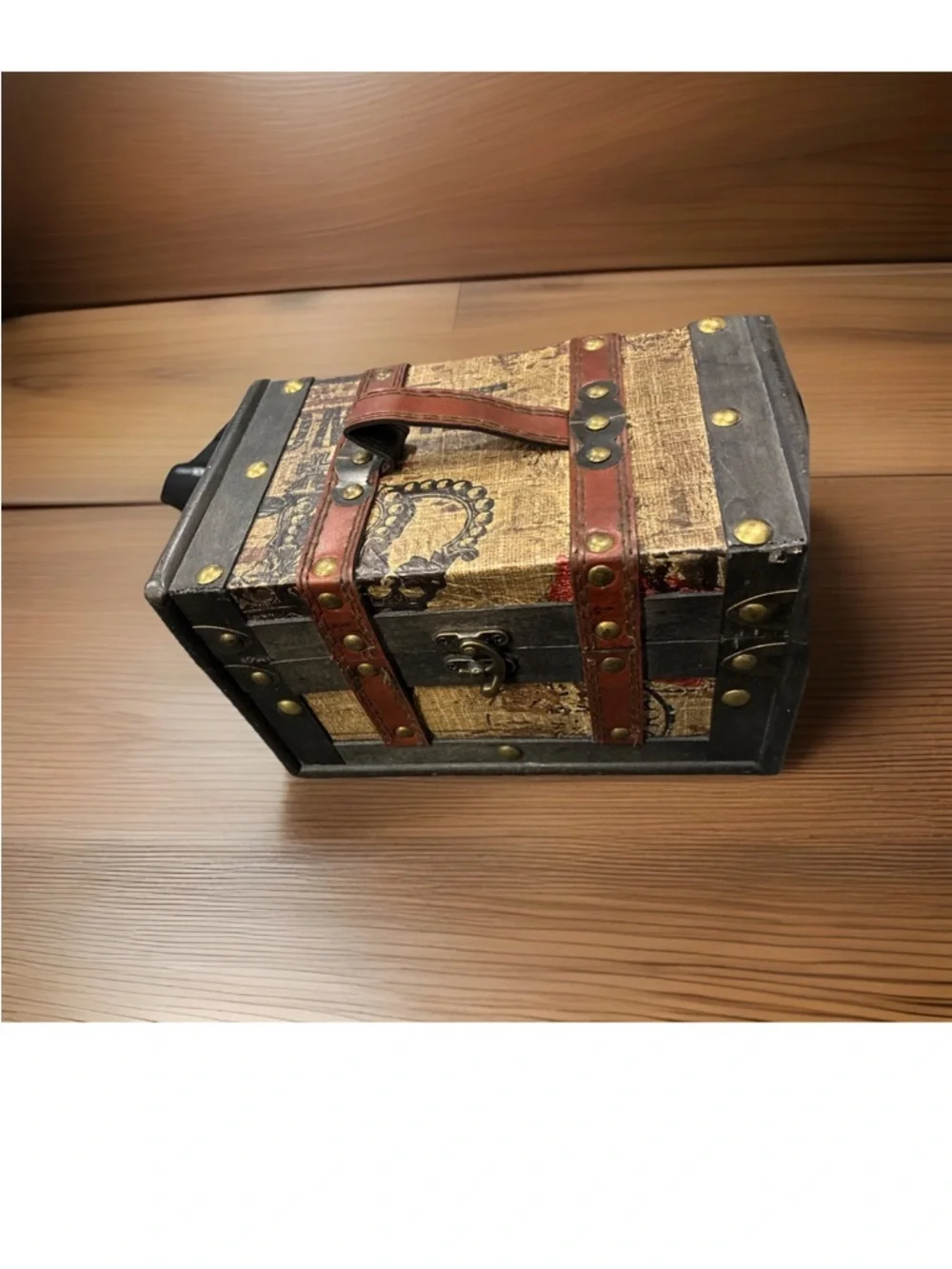 Small Wooden Chest Leather Handles Decorated Vintage Rustic 5x9 In