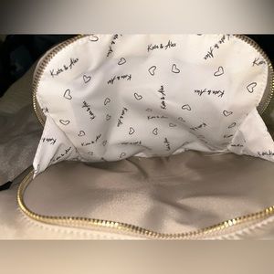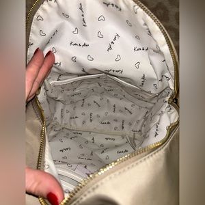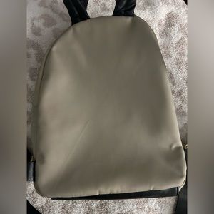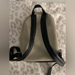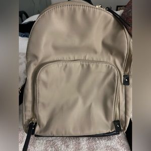 Tan/beige and gold small backpack; used once for a trip; in great condition. Clean, smoke and pet free home. No issues with pockets or zippers. Very cute! One small mark on bottom (black part, see photo) have not tried to remove.