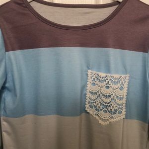 Small, multi-colored tunic with 3/4 sleeve length. Colors include mauve, sky blue, light and dark grey, and navy. No tags, never worn. Bought from amazon and just didn’t fit me well.