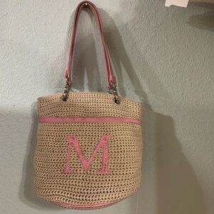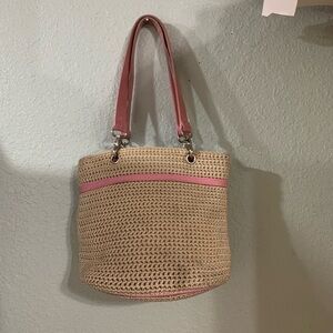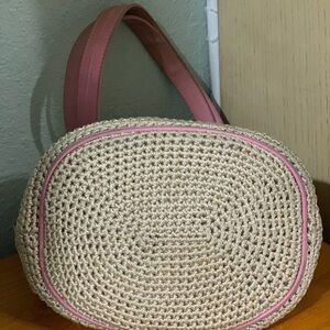 Cute small woven bag cloth handles with Silvertone hardware can be a clutch or a hand carry. All both handles are detachable.