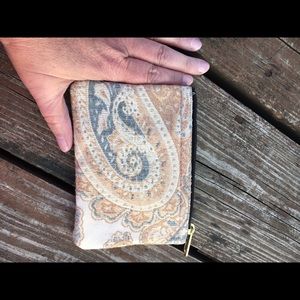 @kulamocka Hello! It is almost like a tapestry material but silky. Kind of hard to explain, there is no tag. It is like a regular purse on the inside, vinyl I think. Hope that helps!