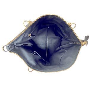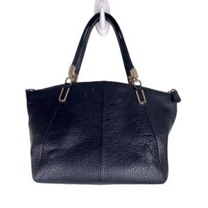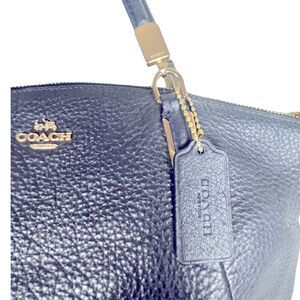 This classic Coach Kelsey shoulder bag is navy pebbled leather in great pre-loved condition. It features straps with a 5.5" drop, one large interior pocket, with one interior zip pocket and 2 slip pockets. The Coach branding is in gold on the front, as well as original Coach tag. The bag has a 14" zip closure on top and measures 12"W x 9"H x 3.5"D, 10"W at base.