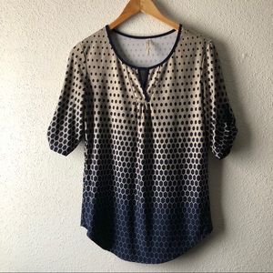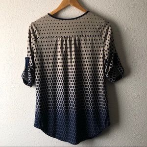 A beige blouse featuring an all-over, blue, contemporary honeycomb designs.