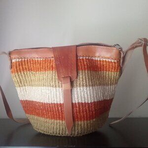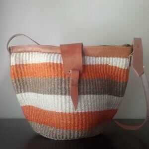 Beautiful Kiondo Kikuyu Kenya sisal bags are beautifully made. Made in Kenya. Leather long strap with leather fasten. Lined inside. Colors are orange, cream and tan. Made by Artisan.. natural fiber of sisal.