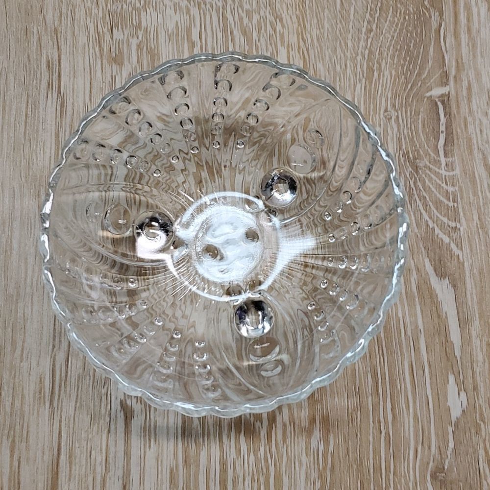 In excellent used condition no cracks or flaws. Small measures 5 inches across. Has 3 small "feet" on the bottom. Can be used for candy, keys, or jewelry. Feel free to ask questions and make offers