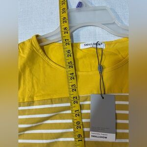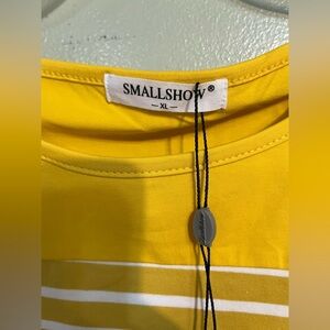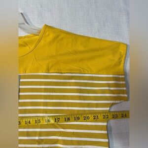 Bright yellow top with white stripes. Short sleeves and a stylish design.see pictures for details and measurements