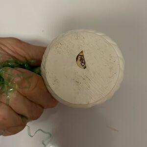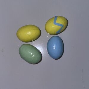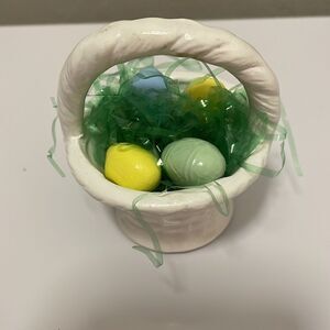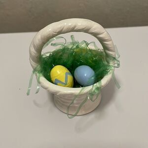 Small white ceramic Easter basket with 4 tiny painted eggs