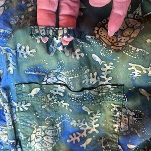 Smart Scrub snap shortsleeved scrub jacket /overlay . Royal blue and green turtle and coral pattern. 3 pockets plus a strip for pens etc sz M