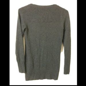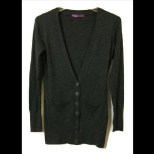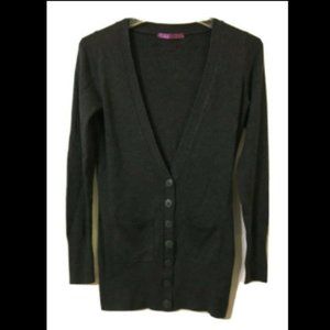 Dark academia. This is a soft, Smart Set, lightweight cardigan, XS in dark gray grey. This angora, acrylic & nylon sweater has 2 pockets, a v-neck & is tunic length. There is ribbing on the top of the back, along the sides, from the bottom of the pockets to the bottom of the sweater & a wide band at the bottom of the cuffs.