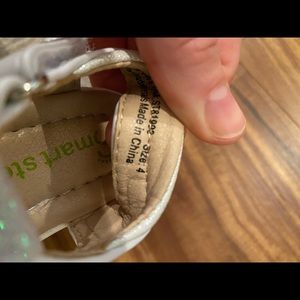 White floral toddler walking sandals, Smart Step brand. Velcro strap, decorative floral piece and glitter feature. Worn once on Easter, and then too small to wear again. Excellent like new condition. Size 4