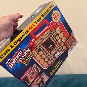Keep your batteries organized with the Smart Storage System. This red organizer holds up to 150 batteries, ensuring they are neatly arranged and easily accessible.