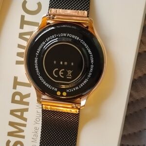 Elegant watch with a gold case and black strap. Perfect for any occasion. this watch comes with two straps. the black metal mesh as well as a neutral color vinyl band. the watch is new I purchased it for myself but my wrist is very very small and the watch is just too big for me. top notch watch. does everything has everything. comes with original box all instructions extra band and charger.