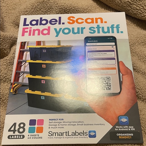 SmartLabels for organizing storage boxes. Includes 48 labels in four colors. Perfect for self storage and moving.