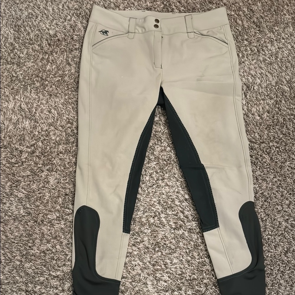 Stylish and durable women's riding pants in beige and black. Perfect for equestrian activities with a comfortable fit. Good condition, but there is a slight stain pictured on the front. Smoke free home!