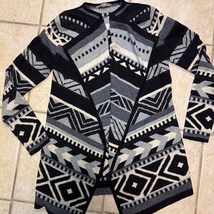 Cozy and stylish Smartwool open-front cardigan featuring a bold black, white, and gray Aztec-inspired geometric pattern. Crafted from a soft merino wool blend for exceptional warmth and comfort. Lightweight draped design perfect for layering in cool weather.