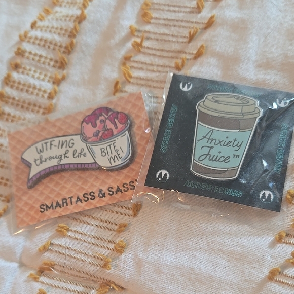 Set of two humorous pins. Features 'WTF-ing through life' and 'Anxiety Juice' designs. Perfect for adding a touch of humor to your outfit.