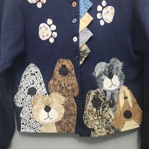 CharSmartly done by Roberta Smart blue cardigan dog size M ming cardigan with playful dog patterns. Features paw prints and colorful patches. Perfect for dog lovers.