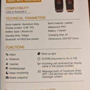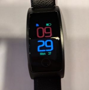 Smartwatch Bluetooth enabled, similar to Fitbit. Compatible with Android phones. Monitors blood pressure, heart rate, calories burned, number of steps, sleep patterns, sedentary reminder, multi-language, water-resistant IP67 (not sure what it means but it's on box). can help you find your lost phone & many other things but I don't have enough room to list them all. I'm selling this because I'm used to wearing gold colored watches & I can't get used to this black on my wrist. Refunds accepted