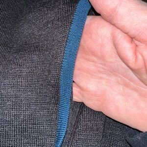 Dark heather gray with blue stitching front and sleeves