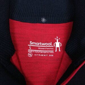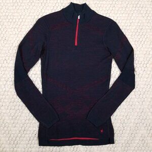 Smartwool "Intraknit Thermal Merino Base Layer Quarter-Zip" top in "deep navy / pomegranate" (dark navy and red). Size small (S). Made from a Merino Sport blend fabric, this base layer top has the temperature regulating and odor prevention properties of merino wool, and the sweat-wicking and quick-drying properties of polyester. Features a quarter-zip front with high-neck and zipper garage, slim fit, 3D mapping for a custom-made fit, and "Intraknit" technology for insulation, articulation and ventilation.