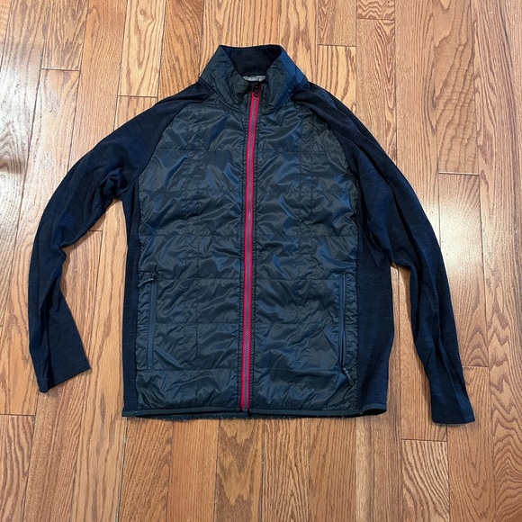 Smartwool jacket in black with red zipper trim. A great light jacket for spring or autumn. Merino wool with a thin down portion on the chest for added warmth. Size Large. In good condition, with some pilling on the bottom seam that would come off with a trimmer.