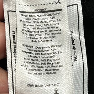 Shell - 100% Nylon; Panels - 54% Polyester, 38% Merino Wool, 8% Elastane; Lining - 56% Merino Wool, 44% Polyester; Filling - 50% Recycled Wool/Reclaimed Wool, 38% Wool, 12% Polyester
