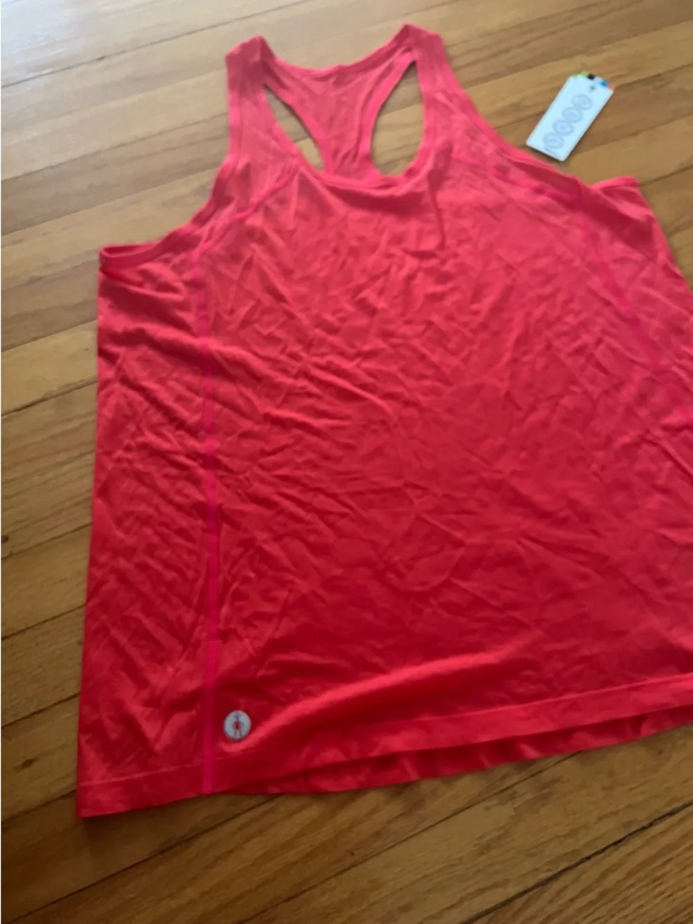 Lightweight racerback tank in vibrant coral. Breathable, stretchy fabric for active wear. Simple sporty design with moisture-wicking properties. Great for workouts or casual layering.