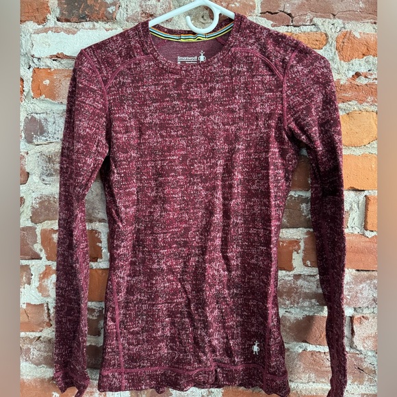 Base layer crew neck log sleeve stop. Marled burgundy 100% merino wool. Dog friendly home!