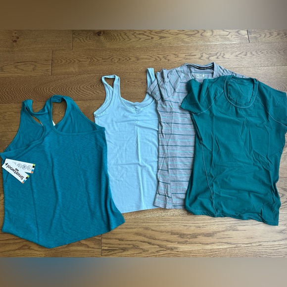 2 shorts sleeve Smartwool tops, icebreaker tank tip and nwt Smartwool racer back top. All size small gently used, washed in wool detergent only, no dryer. Nothing wrong with these, just not my size anymore.
