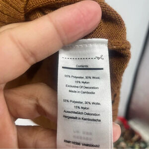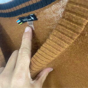 Great sweater. Mens size small. A little oversized. Would fit medium. The sweater is in great condition. There is a pick on the back of one arm. It isn’t a hole. See last photo. Pit to pit 25