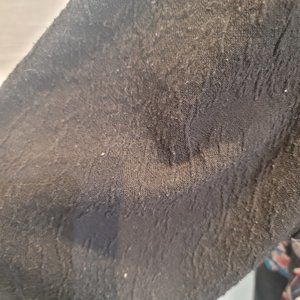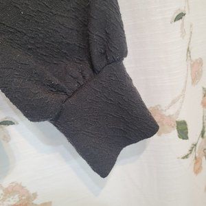 It has balloon sleeves that are textured and long. There is no materials tag, but is a jersey material, so cotton blend with polyester or acrylic most likely.
