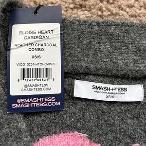 Smash Tess cardigan, Eloise Heart sweater, pink heart cardigan, heart print cardigan, cozy winter cardigan, fall fashion, Valentine’s Day sweater, Galentine’s outfit, lounge cardigan, oversized heart cardigan, cute knitwear, charcoal gray cardigan, romantic sweater, heart graphic, women’s cardigan XS/S, layering sweater, comfy date night outfit, casual chic, fuzzy cardigan, warm knit, cozy layering piece, boutique cardigan, Instagram style, trendy sweater, cozy cute outfit, oversized button front sweater, girly cardigan, heart design cardigan, soft knit layering, comfy oversized knit