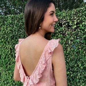 This flowy blush dress is perfect for your weekend adventures. The ruffled look and adjustable waist strap accentuates your shape. It features double lining making it easy to wear.