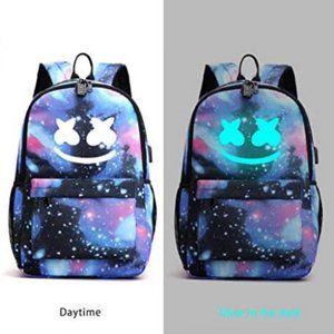 Super cool glowing backpack for DJ music obsessed kids boys and girls, the perfect gift for DJ fans. After absorbing the light for about 10-20 minutes, the smiling face of the backpack can be seen glistening in the dark. This product does not include charger, earphone and mobile phone. Best back-to-school option for teenage boys and girls, middle school and college students, adjustable soft strap, gift safety lock. Smile printing design using environmentally friendly luminescent powder
